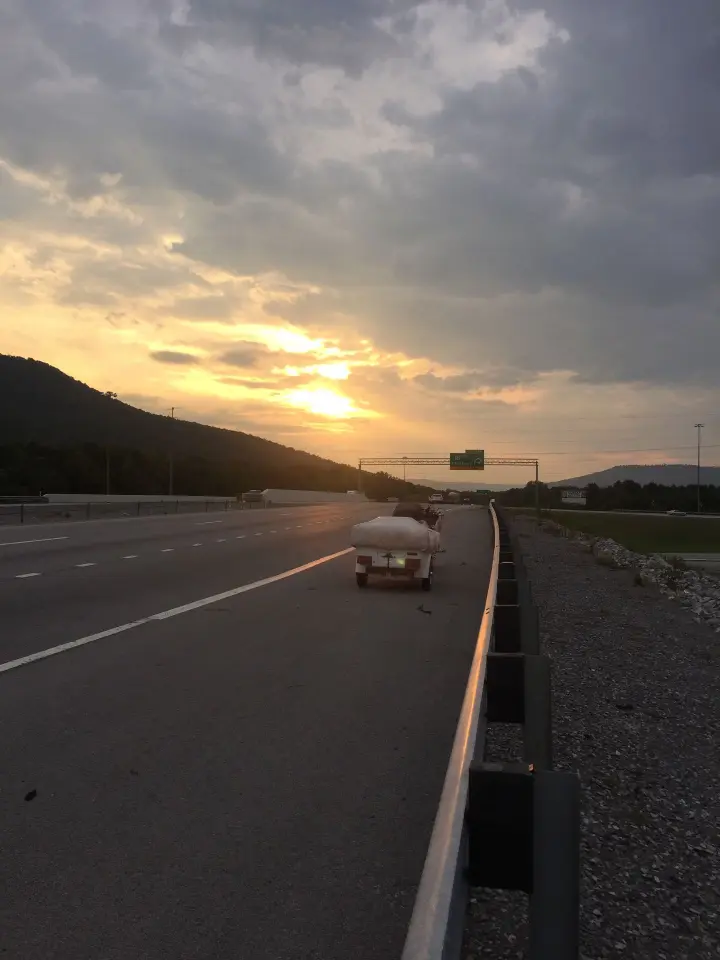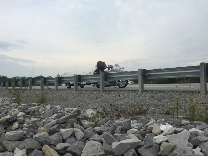 If you look at the sunset photo, you will see that the shoulder was unusually wide, there was a turn lane for the exit ahead that served as a buffer between the bike and the traffic passing by. There was also a guardrail at the edge of the shoulder, which is where I spent most of my time (on the other side of the guardrail from the bike and traffic).